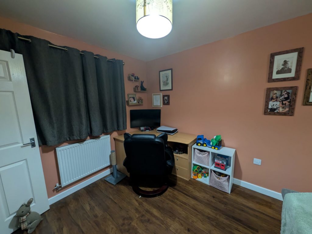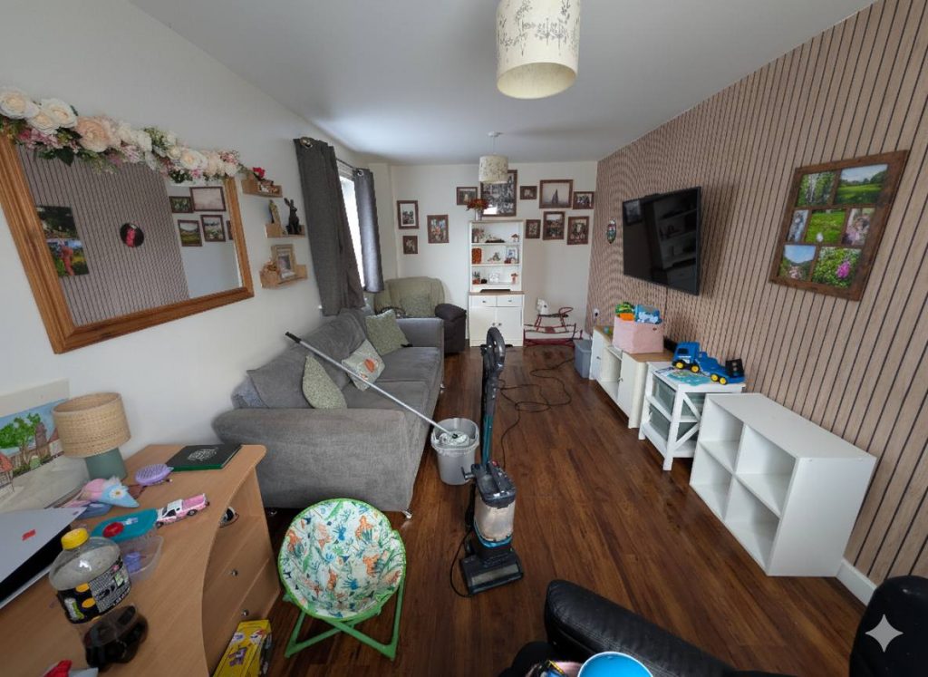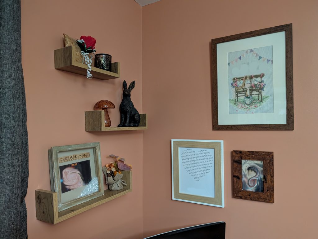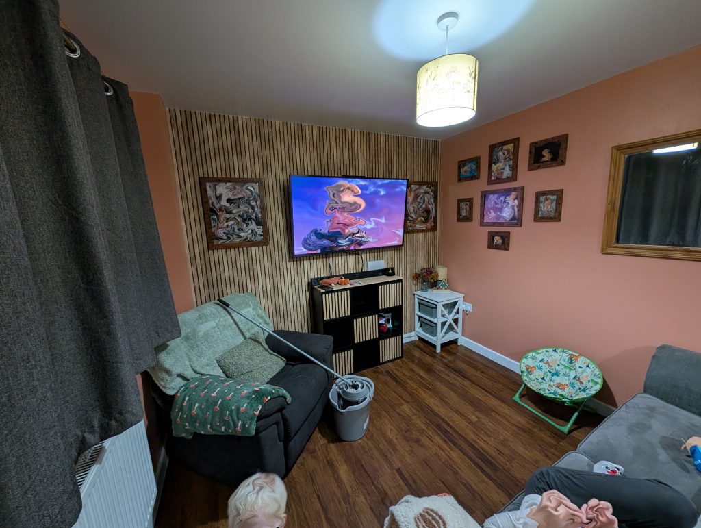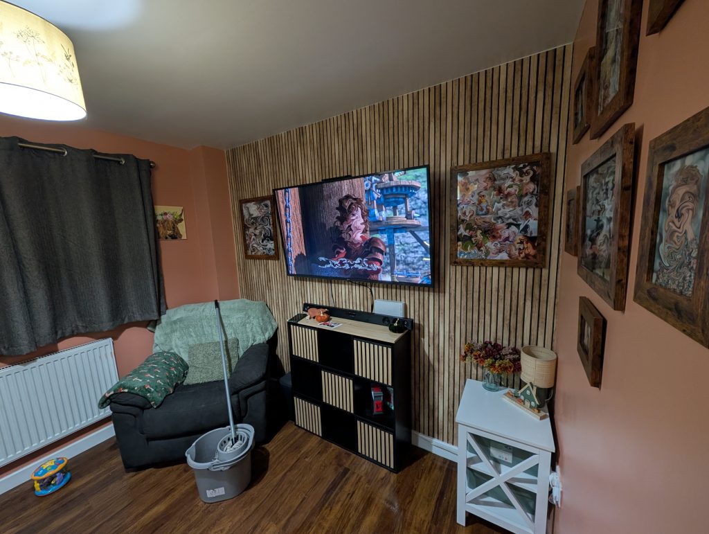 A full living room transformation featuring acoustic wood panel-style wallpaper, freshly painted walls in Dulux ‘Copper Blush’, woodwork finished in Dulux ‘White’ satinwood, and a carefully curated display of artwork and family photos. This makeover turns a long, open corridor-style space into a warm, cozy living room with a dedicated office area at the far end.
