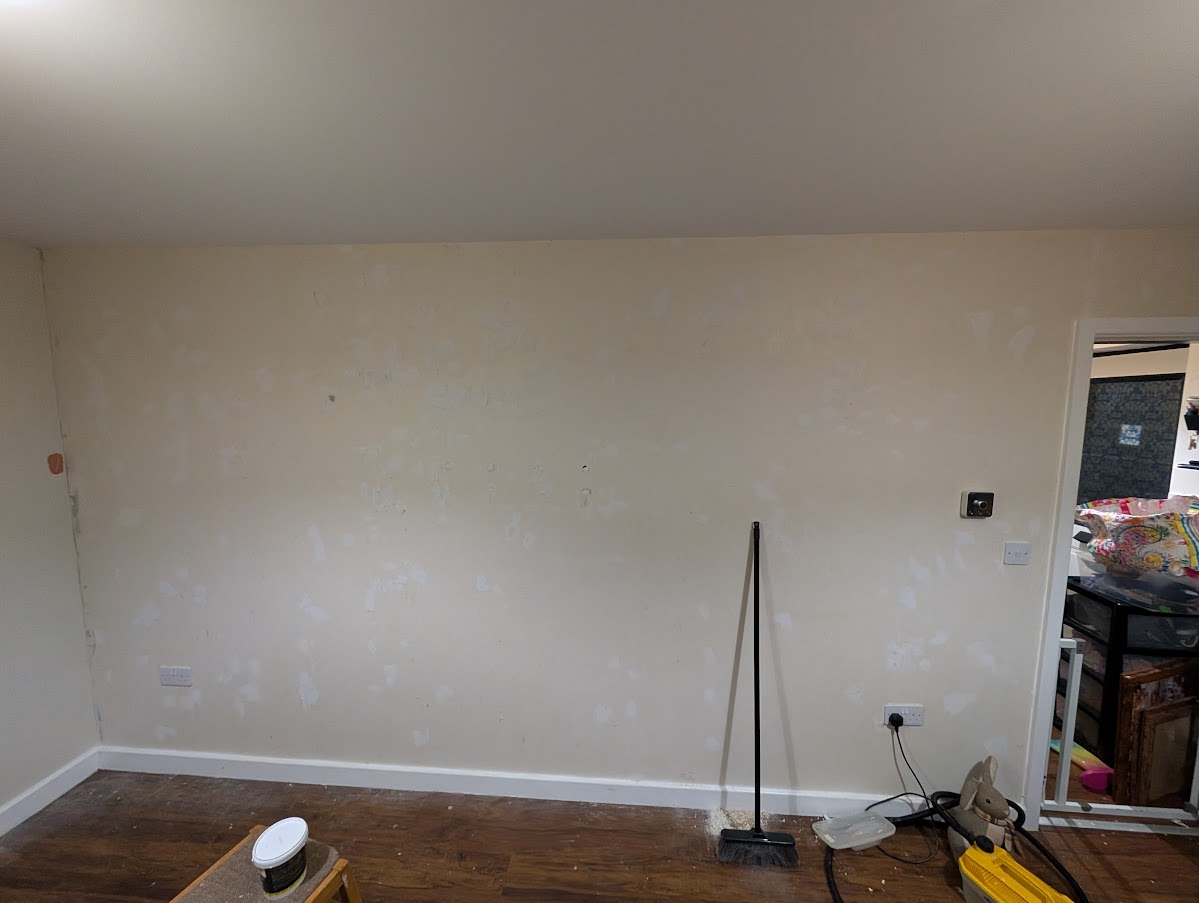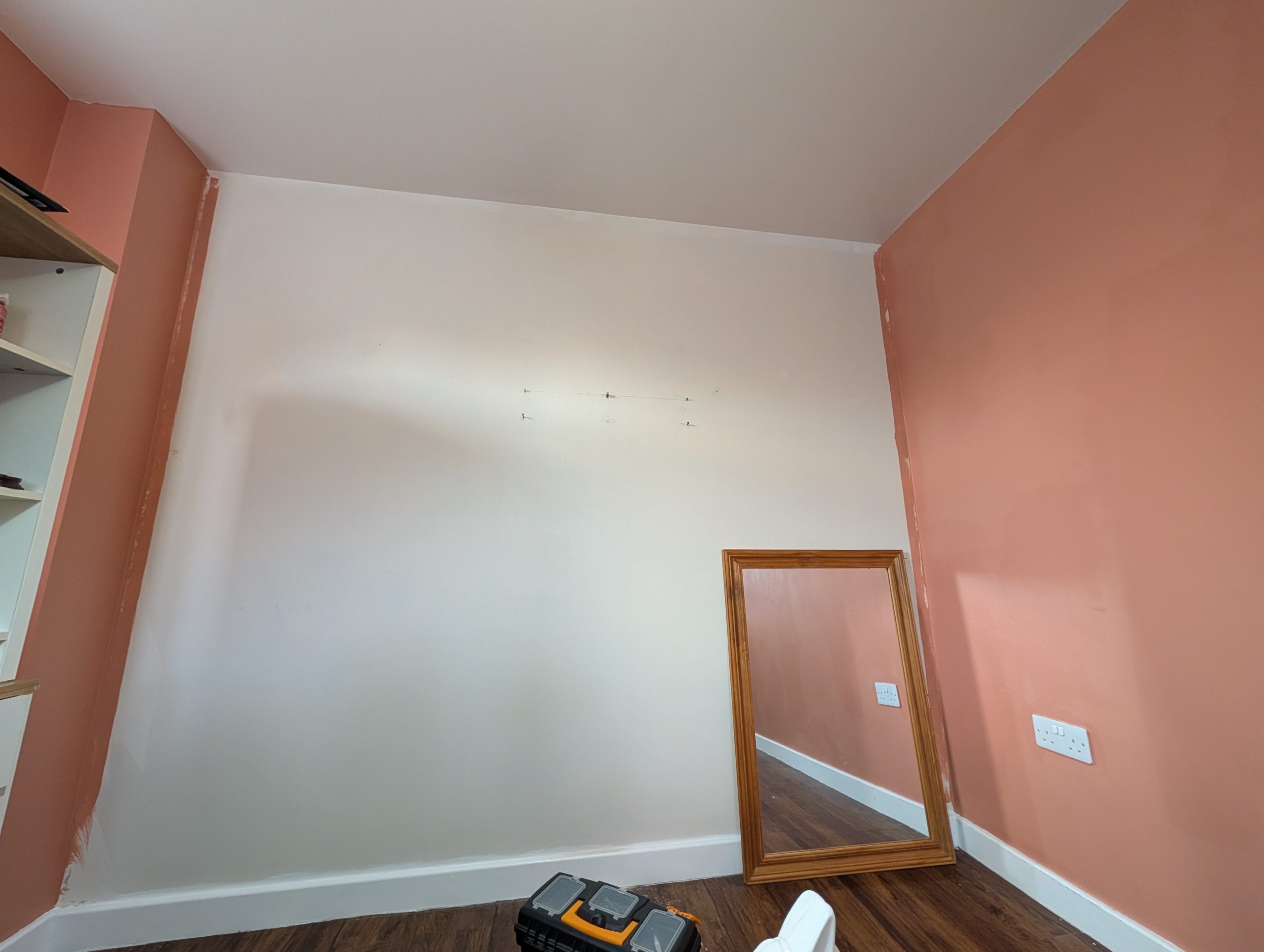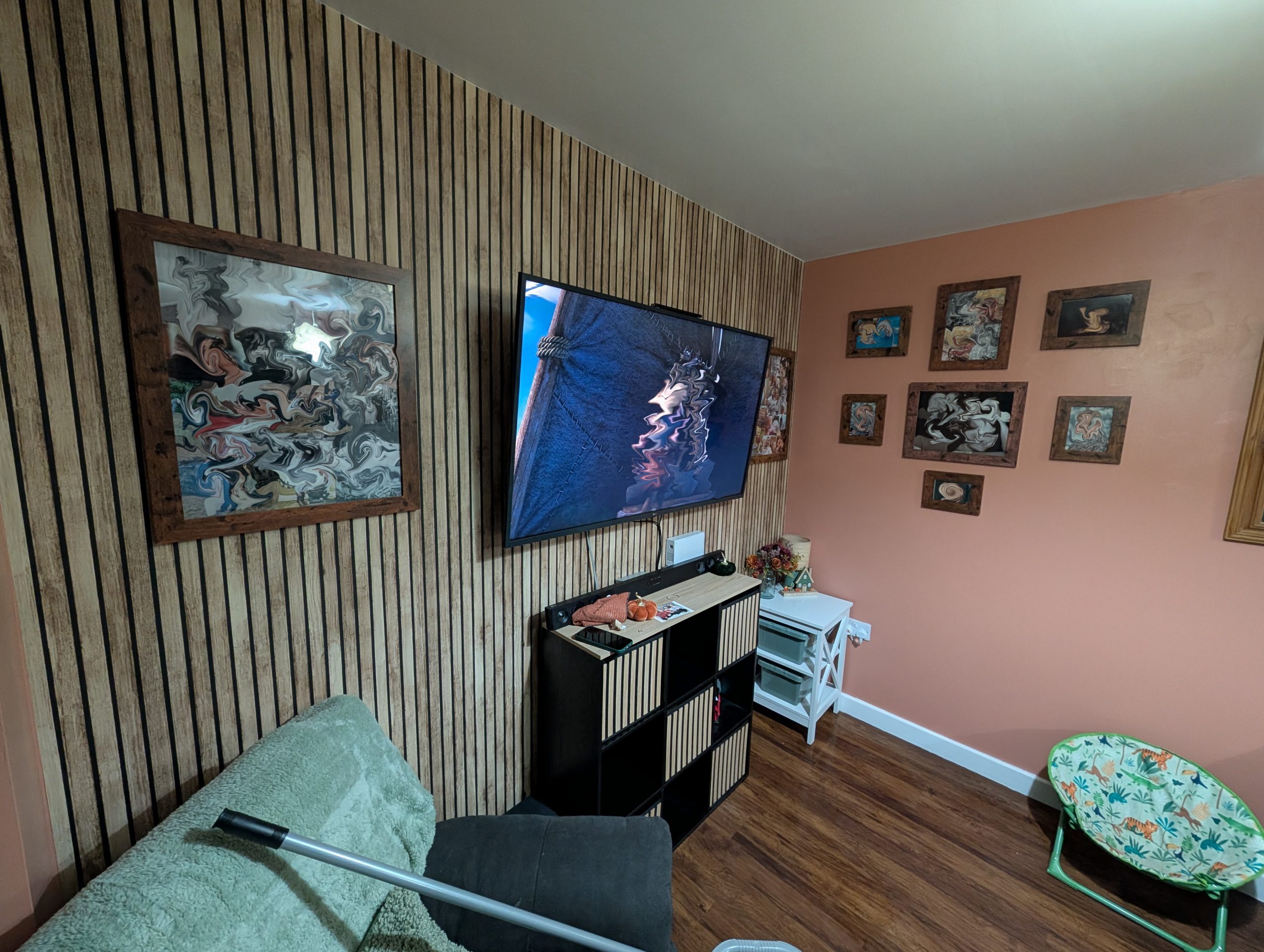 Mr. & Mrs. T, longtime family friends, asked me to remove their wall-mounted TV and bracket, reposition it on another wall, and assist with hanging pictures and decorations. In the end, I also helped paint the walls and ceiling, apply wallpaper, and complete the finishing touches on their décor.