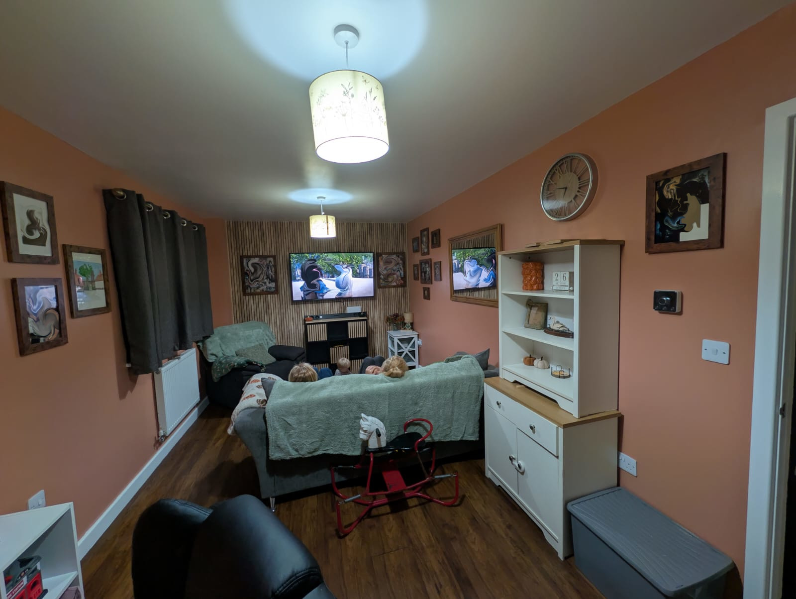 A full living room transformation featuring acoustic wood panel-style wallpaper, freshly painted walls in Dulux ‘Copper Blush’, woodwork finished in Dulux ‘White’ satinwood, and a carefully curated display of artwork and family photos. This makeover turns a long, open corridor-style space into a warm, cozy living room with a dedicated office area at the far end.