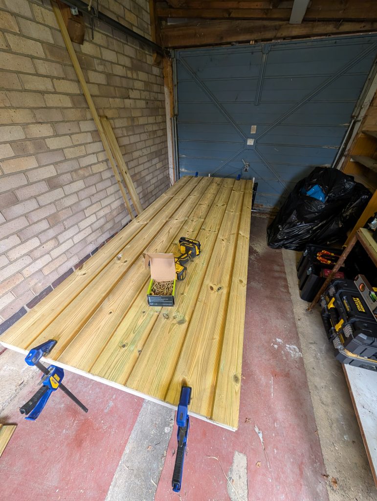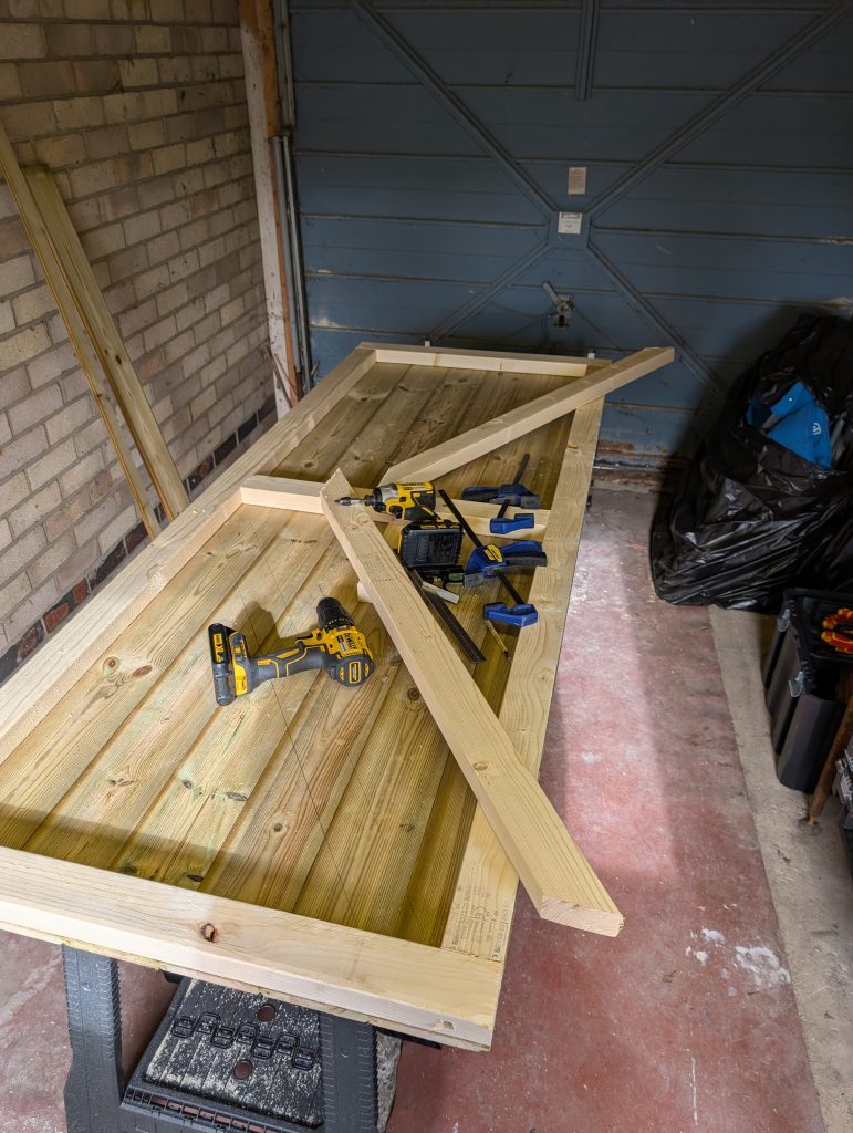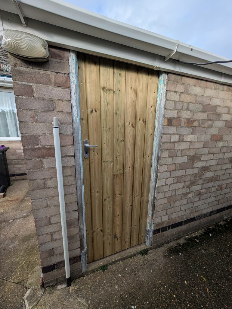 The door was fabricated from a 3″ x 2″ frame, 20mm tongue and groove paneling, a mortice lock and fire-rated ball bearing hinges. As the wood was pre-treated I also offered a return visit to paint, stain or varnish it for free. One very satisfied customer who has already had me back for repeat work and more to come.