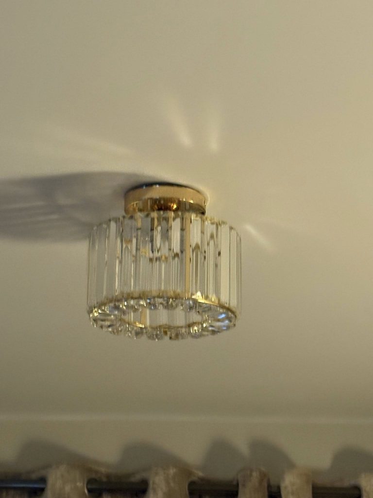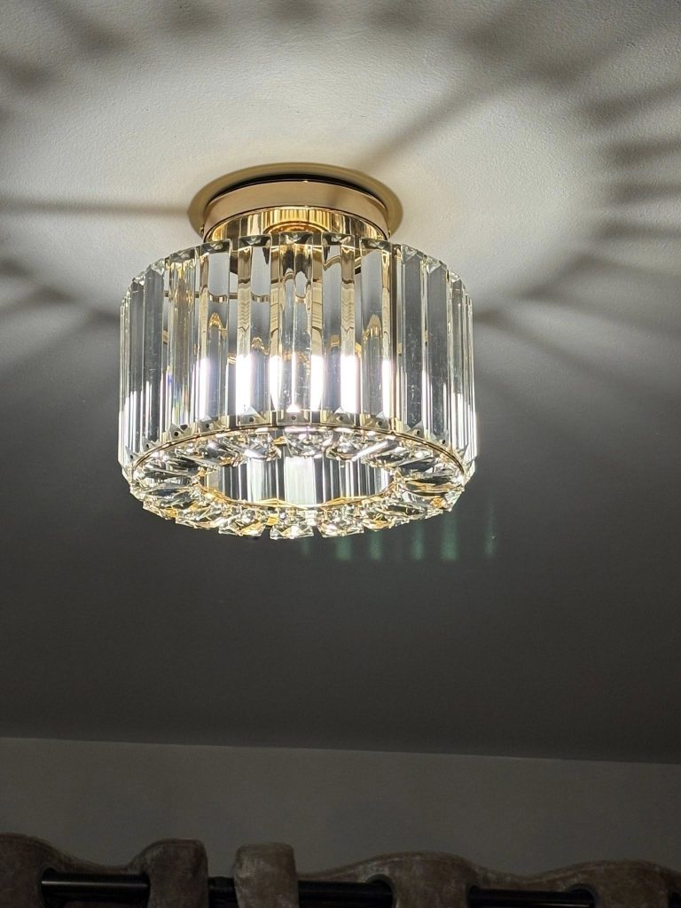 Mrs. T was frustrated with how dull her ceiling lights made the room feel. This was the second set she had installed after being unhappy with her initial choice. Both fixtures were replaced to transform the room’s ambiance with fresh designs, complemented by new brushed nickel switches. She also chose to update the lighting in the kitchen and water closet, creating a modern rustic vibe.